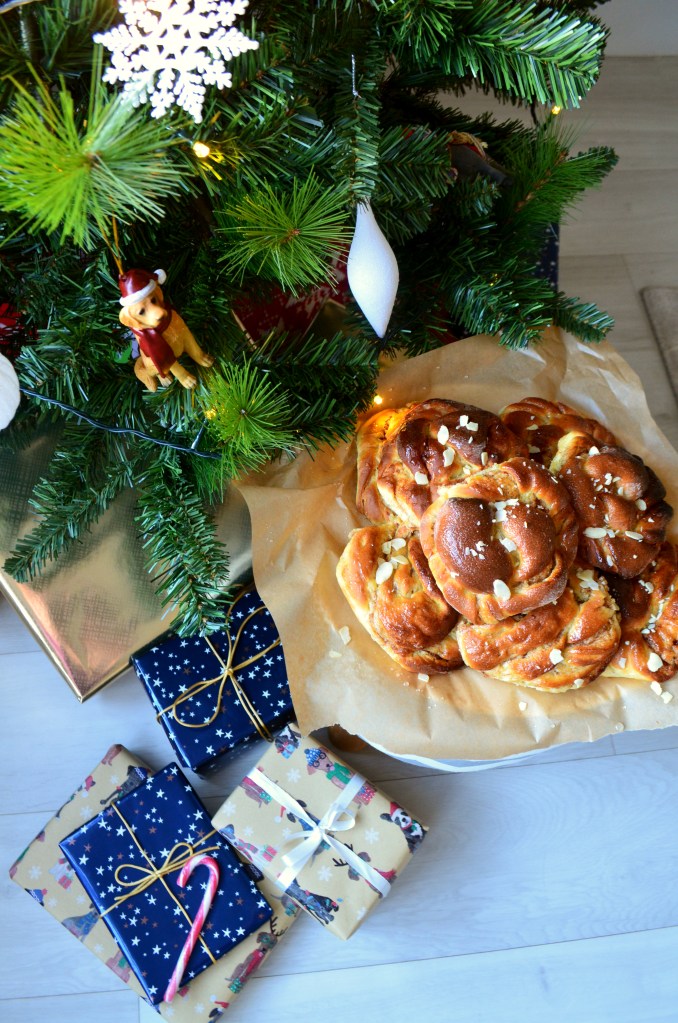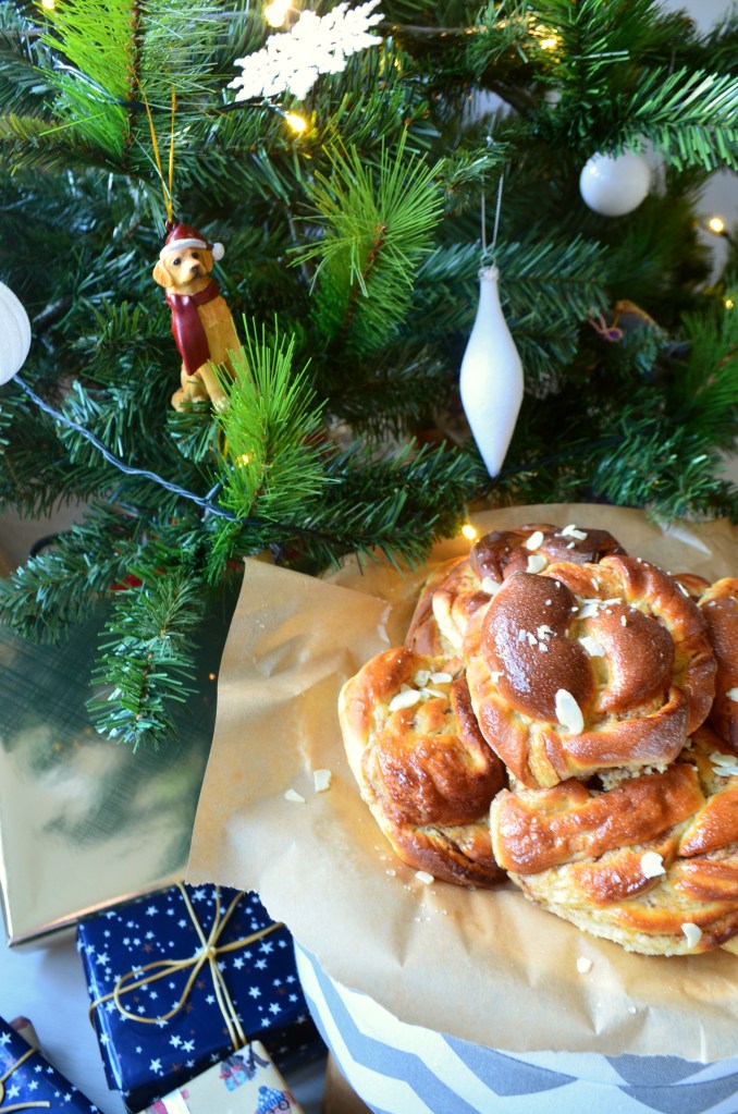But, Christmas Food? Oh, that is one tradition I’m happy to clutter my kitchen with, my friend. And if there’s one thing I do like about Christmas Decorations is that they do get me in the Christmas Food Mood. It took us a good couple of hours to get the decorations up on Saturday (which was two hours too long, in my opinion) – but on Sunday, I spent at least double that time happily baking away in the kitchen and whipping up these Saffron and Cinnamon Knots. They’re kind of a mix between traditional Swedish Kanelbullar and the St Lucia Saffron Buns that are traditionally eaten on the 13th of December (this Friday!). An enriched, sweet dough in a lovely shade of gold, with a sweet cinnamon filling twisted through the middle. So delicious, so moreish and perfect for scoffing in front of the tree. 🙂